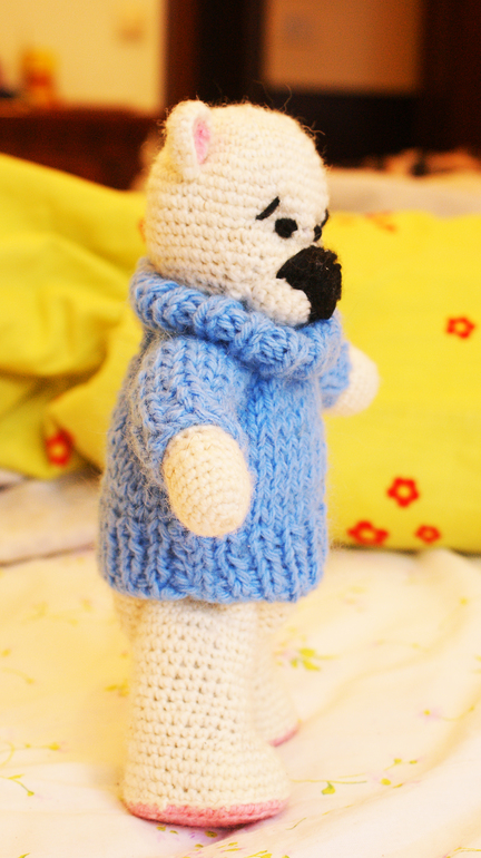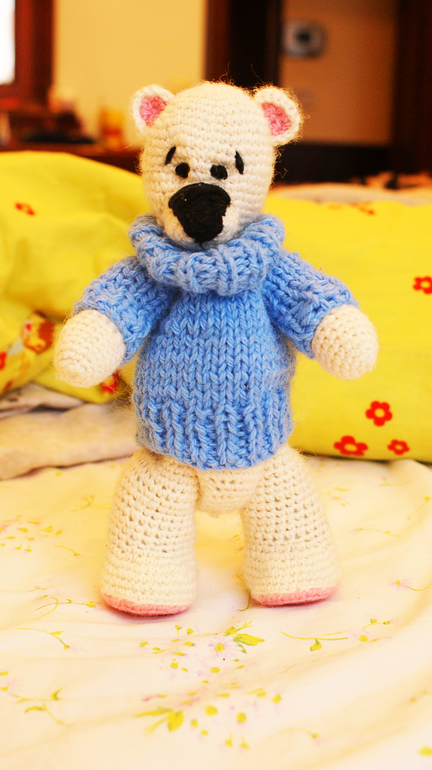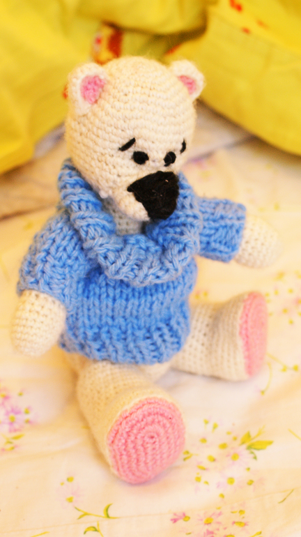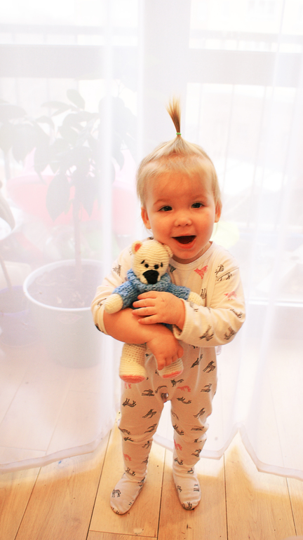 Милый! Дочка главный ценитель красоты и теплоты маминых рук :-) моя доча просто обожает вязанные игрушки, тоже из рук не выпускает. Я как то вязала ей миниатюрного мишку, прям под ее маленькую ручку, так она и во сне с ним не расставалась :-)