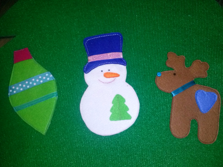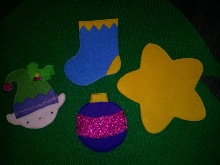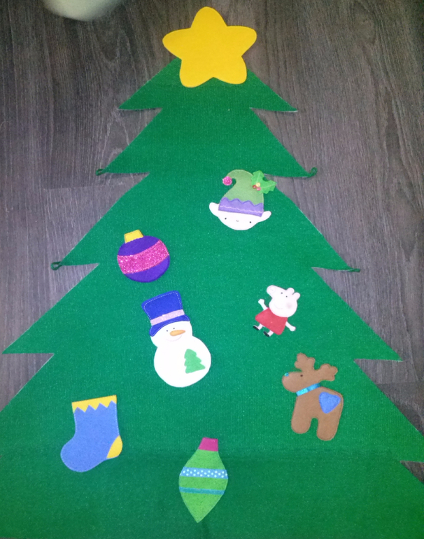 Елочка из велкроткани, игрушечки из жесткого фетра. Игрушечки на липучках, прилепляешь куда хочешь. Фотографировать нормально не дает доча, уже хочет играть))