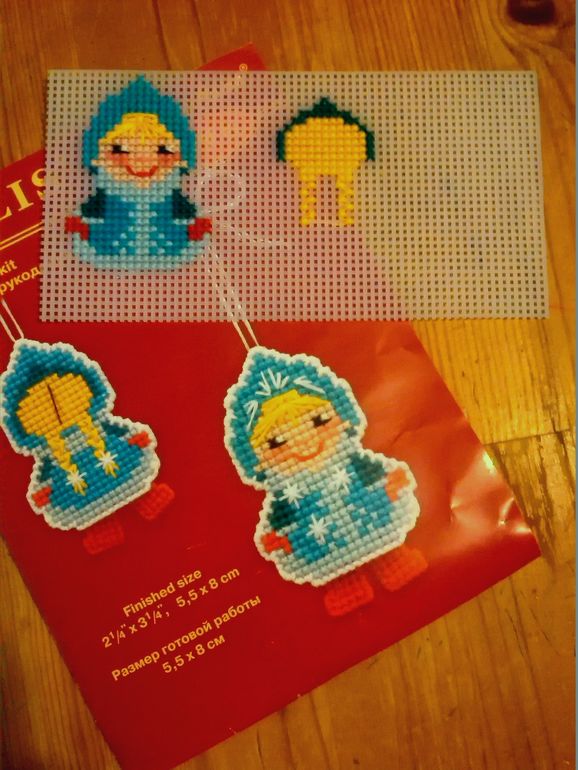 Чтобы не приставать к ней с вышивкой (мне то тоже хотелось попробовать), я купила и себе набор для вышивания на пластиковой канве - Снегурочку - игрушку на ёлку.