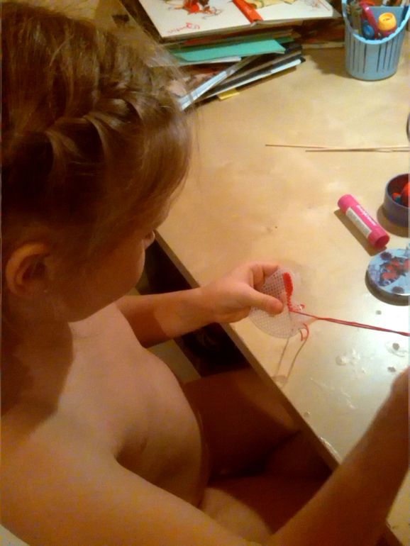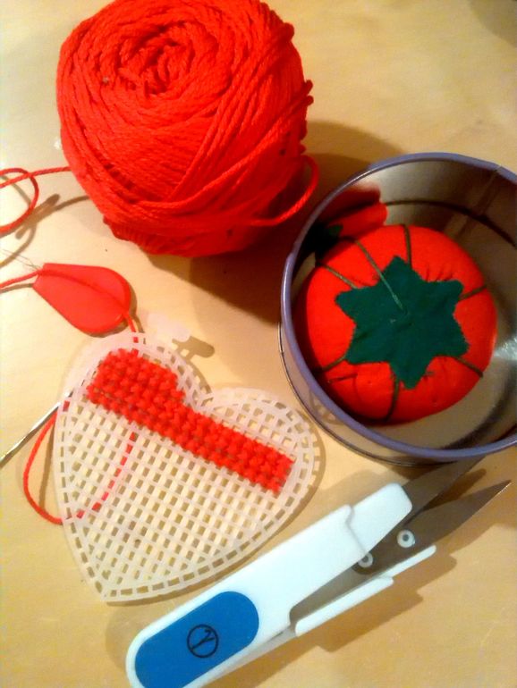 Я идею эту не оставила, и зайдя в очередной раз в магазин, увидела фигурки из пластиковой канвы - сердечки и звездочки. Небольшие, с крупными ячейками. Я подумала, что это как раз то, что Даше подойдет! К тому же, она хотела Диме на день рождения вышить сердечко.