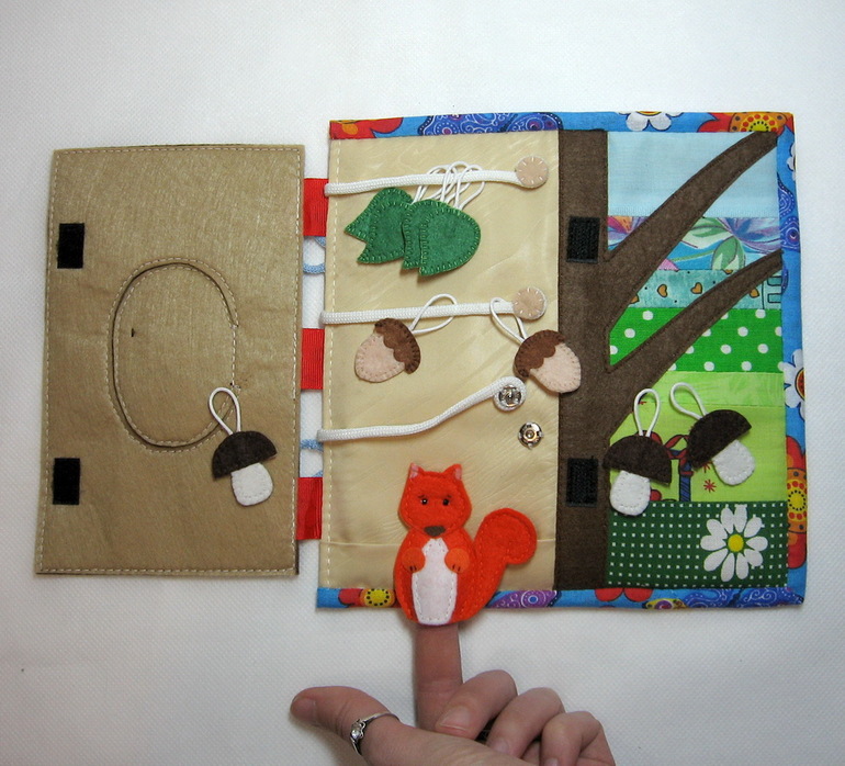 Страничка 4 - это моя хитовая страничка - белка и ее запасы. Повторяем счет; развиваем мелкую моторику, нанизывая грибочки, жёлуди и листочки. Белка - это пальчиковая игрушка, может путешествовать с малышом по всем страничкам книжки.