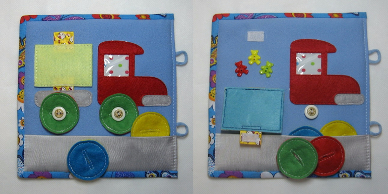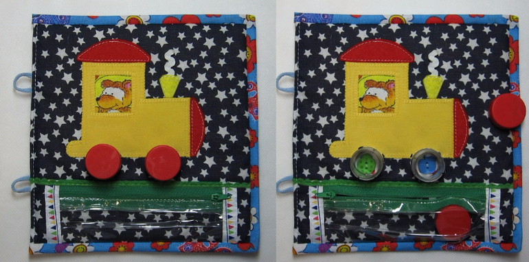 Страничка 8 - паровозик с навинчивающимися колесами. Под крышками спрятаны секретики-пуговки. В карман на застежке-молнии можно положить дополнительные съемные колеса