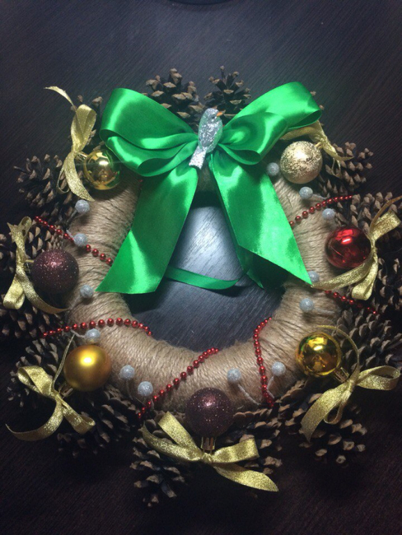 Первый раз смастерила такое чудо!задумывалось изначально не так, но шишки оказались слишком велики для моей заготовки!Компоновала из того, что имелось!Честно, вдохновения почему-то совсем нет!Любимый говорит, что веночку чего-то не достает!Веточек елки что ли?