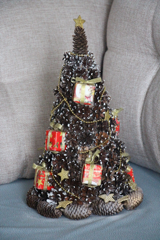 Мне очень нравится, но как перфекционистка я бы чуть приукрасила верхушку. Особенно переход между вертикальной шишечкой и основной елкой немножко сгладить может...Может бантик золотистый туда как нить приляпать? Или вообще верхушку изменить...)