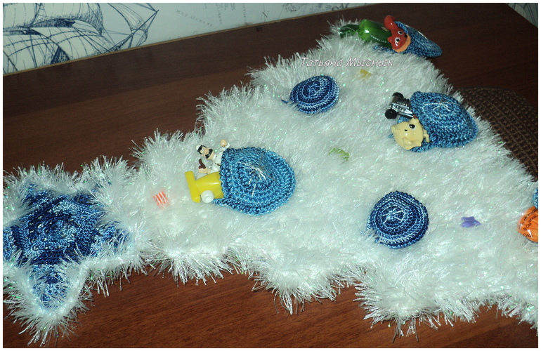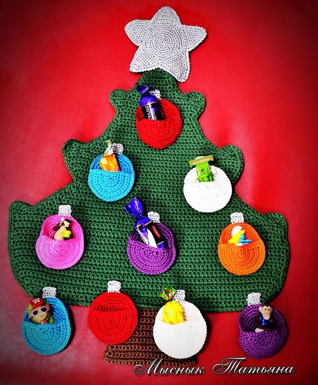 Наконец-то довязала ёлочку с кармашками, для приятных сюрпризов, в комнату моим мальчишкам! Пряжа травка, причем она переливается разными огоньками-бликами, зеленого, синего и фиолетового цветов. Фотоаппарат конечно не передает этого....
