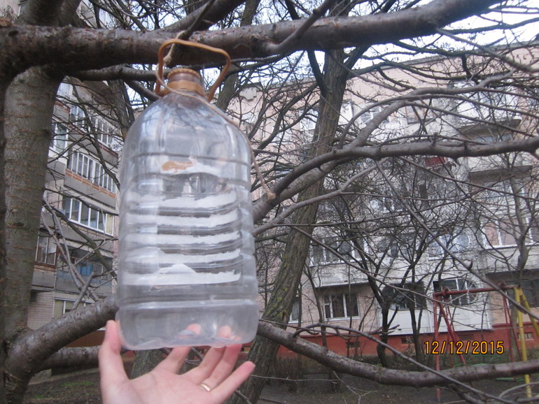 Бутылка была из-под растительного масла, Артемка ее хорошенько помыл, вырезал отверстие и мы пошли на улицу вешать ее на дерево.