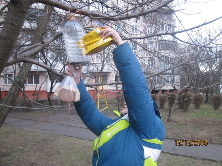 12 декабря - нужно было сделать кормушку для птиц(для этого специально подобрала на улице большую бутылку).