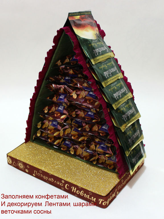 Идея понравилась! Захотелось сделать такую елочку. Но так как я никогда не занималась сладкими букетами, сразу возникли вопросы. Как прикреплять чай? Пакетики специально верх ногами располагаются? Если конфеты просто сложить, они же при малейшем движении рассыпятся. Конфетки как-то скрепляются?