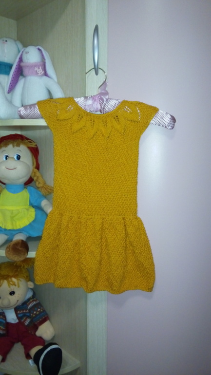 Платье вязалось на праздник осени в детском саду.В итоге его заменили на день матери и дочку переодели в сарафан для танца Кадриль.Чуть обидно...не покрасовались.Но теперь носим на каждый день. Расход два мотка Ализе дива.Все одним полотном.Шов сзади. Кстати шов чуть повело, то ли от ниток хотя ими уже вязала платье крючком.То ли от жемчужного узора...