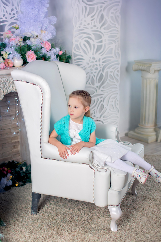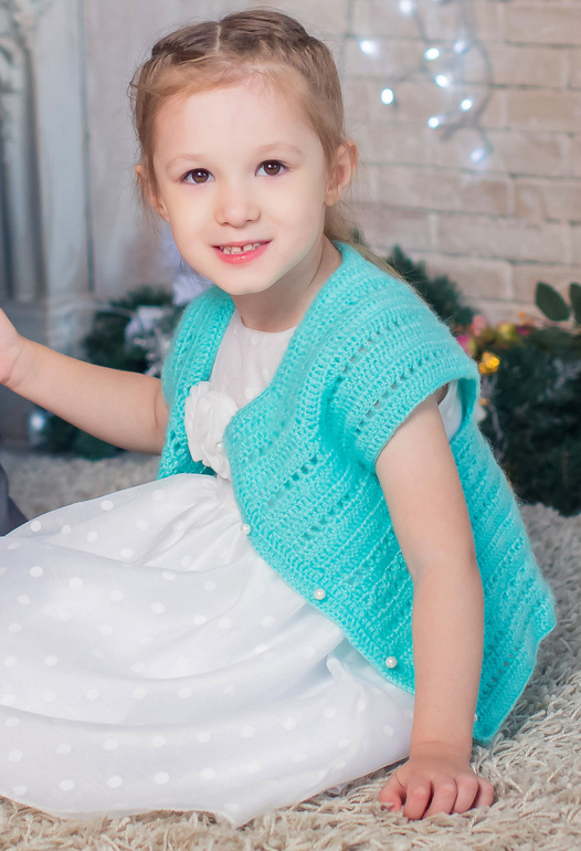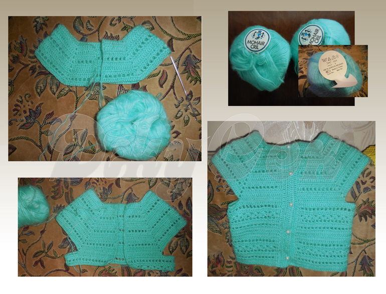 Были у меня мохеровые ниточки, 100% акрил, чуть ли не советских времен. Связала себе жакетик, а нитки остались. Поэтому родился жакетик и для дочки. Очень простой в исполнении. Вяжется одним полотном, реглан. Крючок №2.