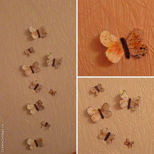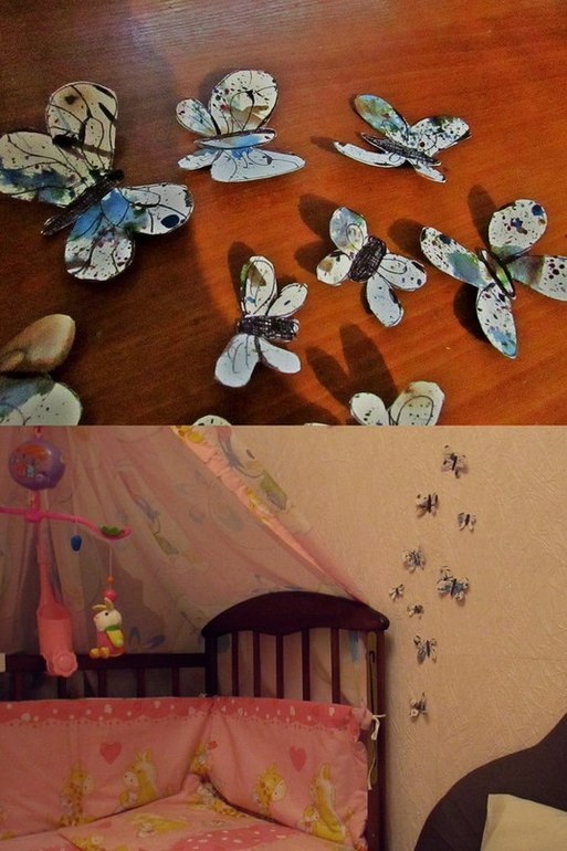 Декор, витражи.Берем лист картона(я брала коробку из-под детского питания),акварельной краской делаем хаотичные пятна на картоне,даем полежать картону час. Вырезаем бабочек с картона, можно дорисовать недостающие детали ручкой (карандашом) и вуа-ля!)