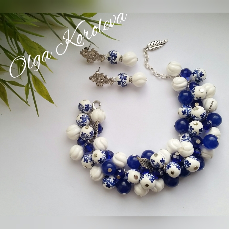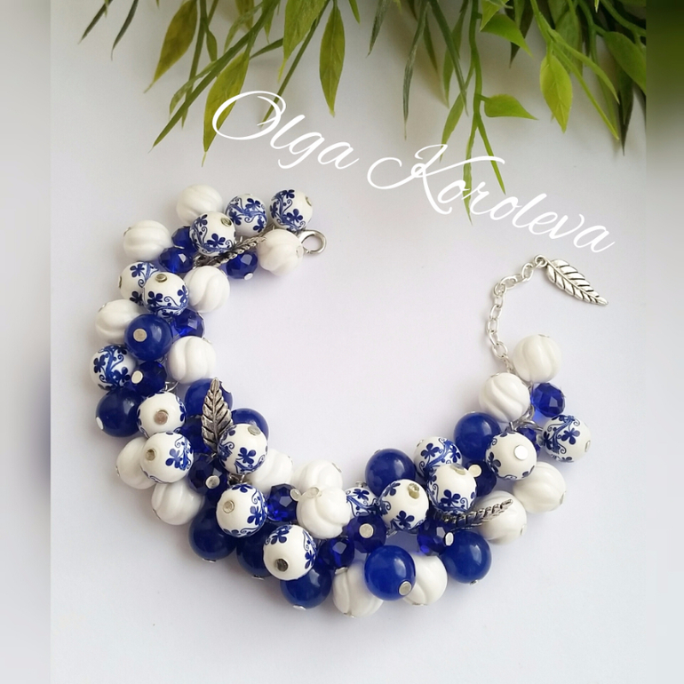 Браслетик-гроздь с резным агатом, тонированным агатом, керамикой и стеклом. Основы-гвоздики с цирконами и посеребрением. Надеюсь подарок понравится хозяйке!