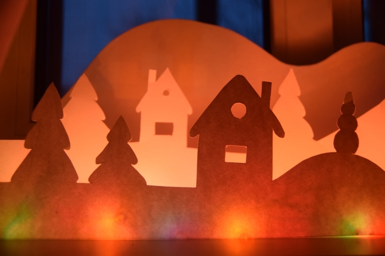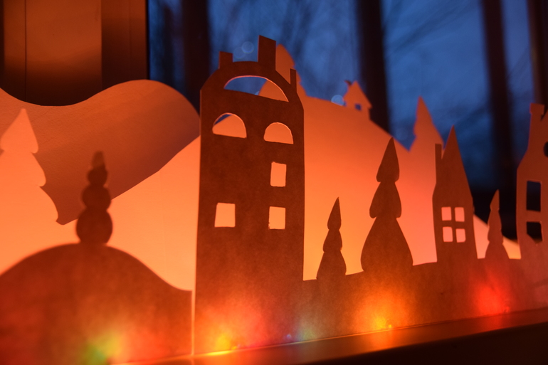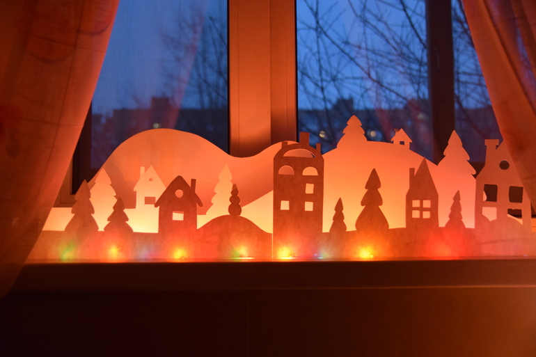 скажите пожалуйста, а за счет чего стоят эти рядочки с городком? нужно сделать сгиб? приклеить к подоконнику?...