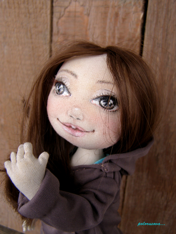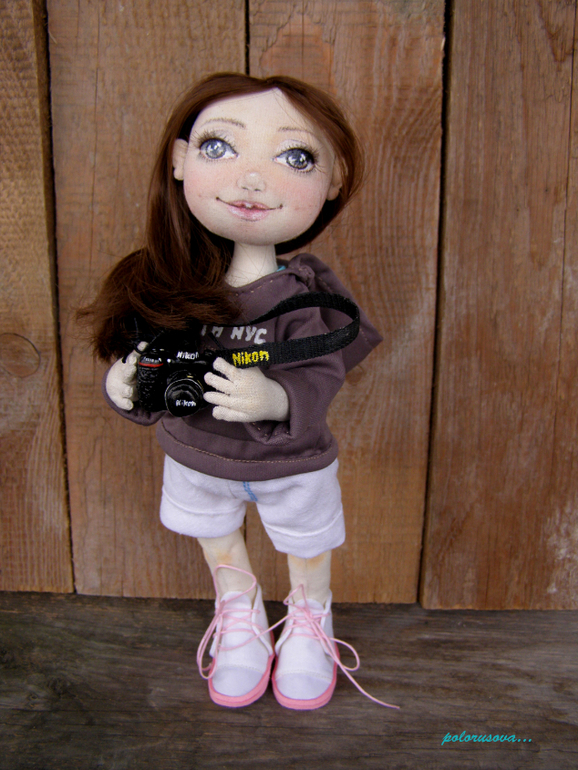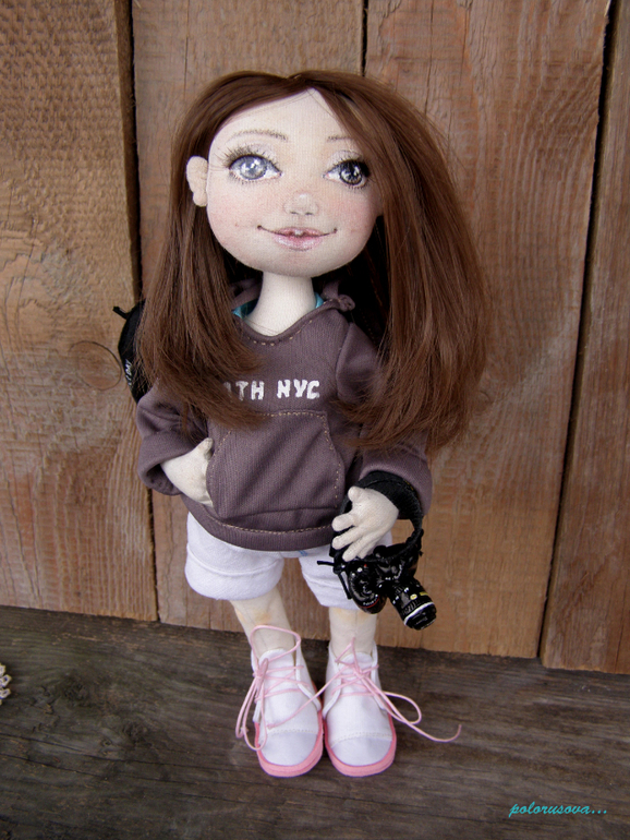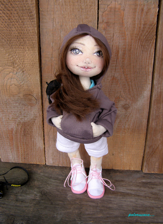Игрушечный мир - животныеЧудесная девушка с фотоаппаратом и рюкзачком. Сшита из небеленого хлопка, в ручках каркас, может удерживать лёгкие предметы.Стоит устойчиво, крепление пуговичное, ручки и ножки подвижны. На ножках кеды ручной работы. Волосы проклеены и прошиты, можно причесывать и делать прически.Рюкзак сшит из льна, принт wolfskin - акрил. Толстовка из трикотажа, под ней трикотажная майка. Шортики льняные. Вся одежка съемная. Капюшон одевается. Фотоаппарат изготовлен вручную из полимерной глины.