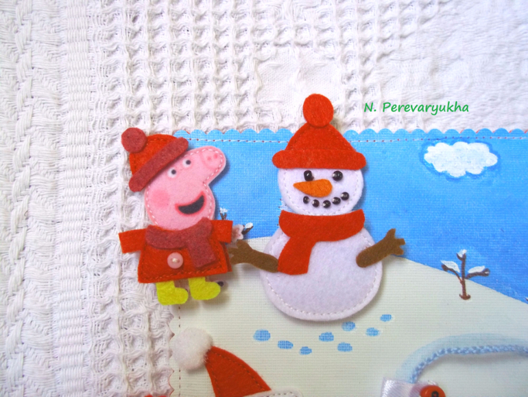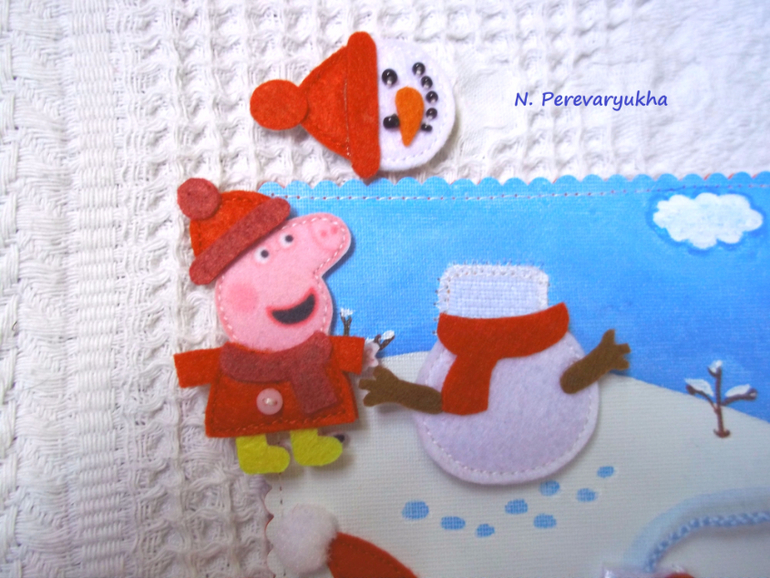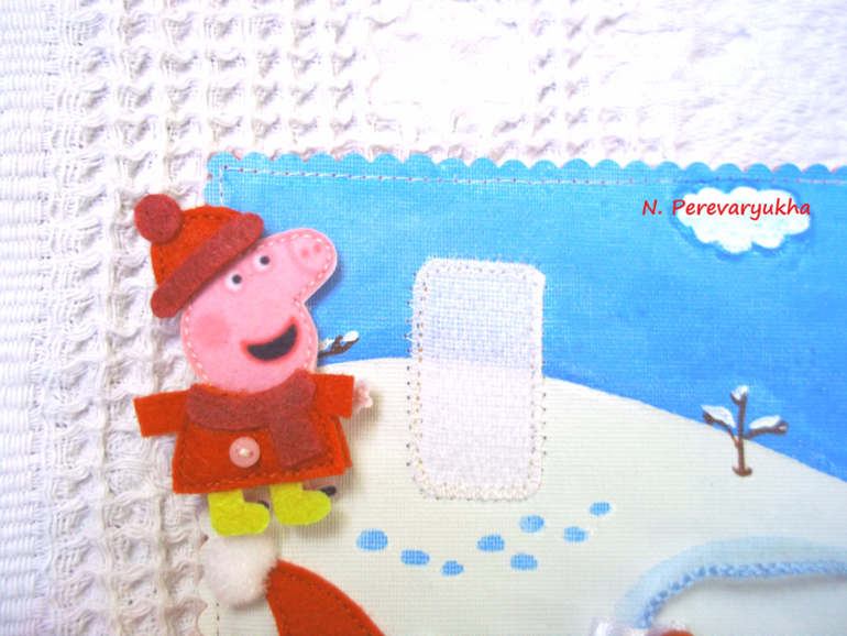 Лепим снеговика вместе с Пеппой: в левом верхнем углу есть липучка, на которую нужно поставить снеговика (он из двух деталей).