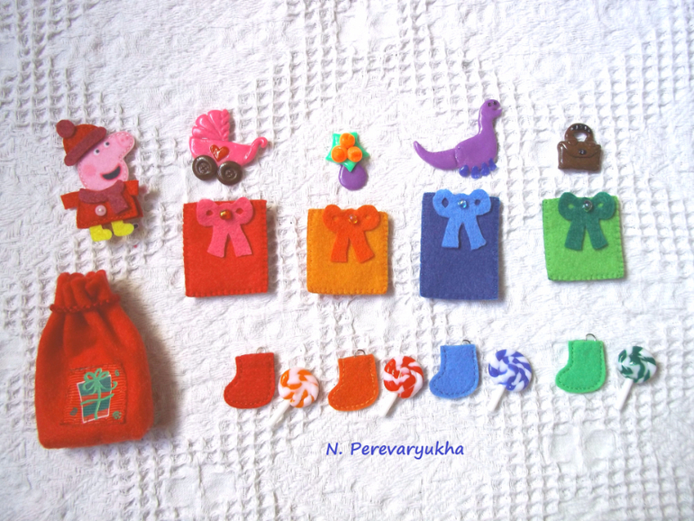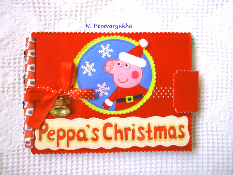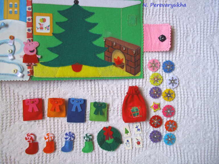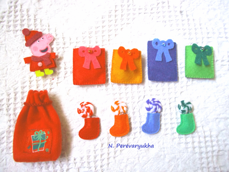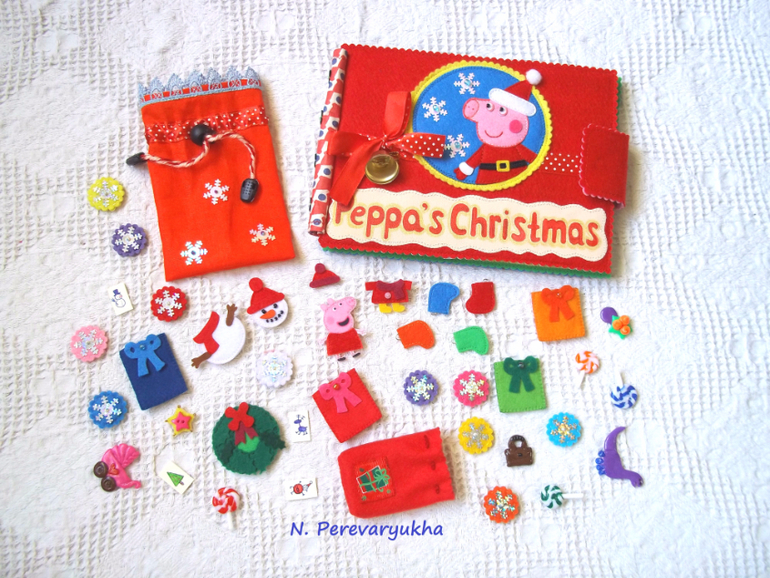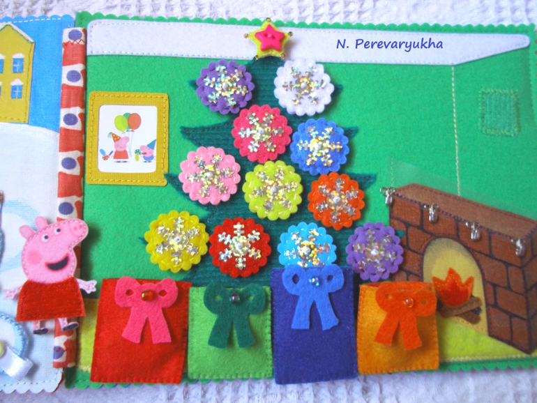 Развивающие игрушкиХотелось бы показать свой новый яркий праздничный разворот для поклонников свинки Пеппы. Шилось все это из фетра, украшения- пуговицы, ленты, бусины, кое- какие моменты рисовала акриловой краской для ткани.