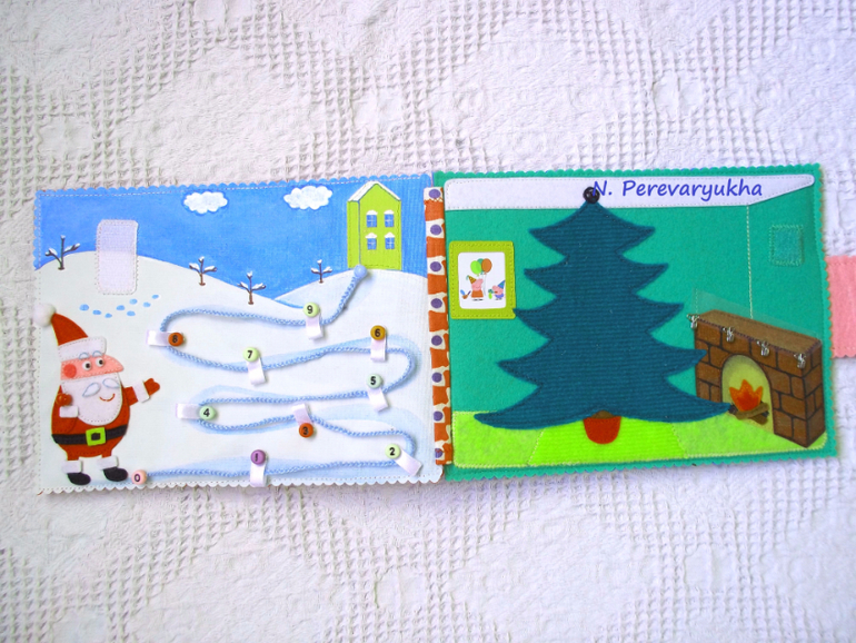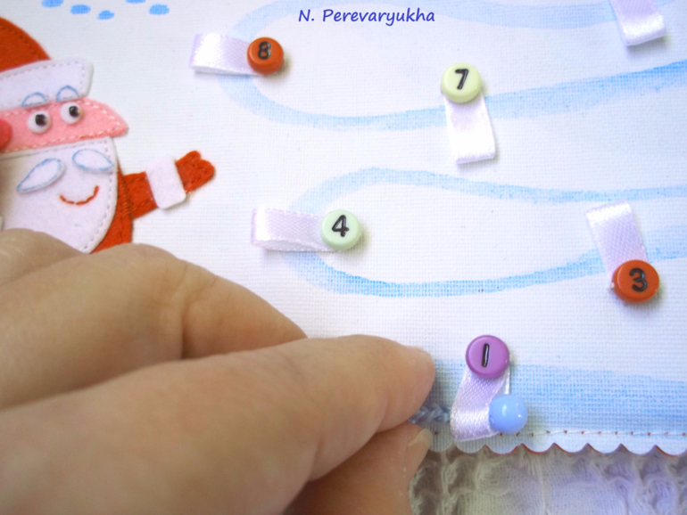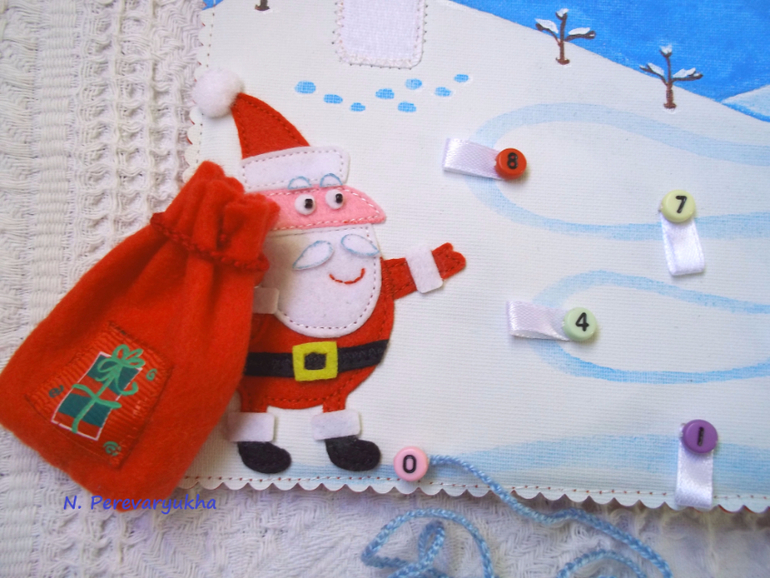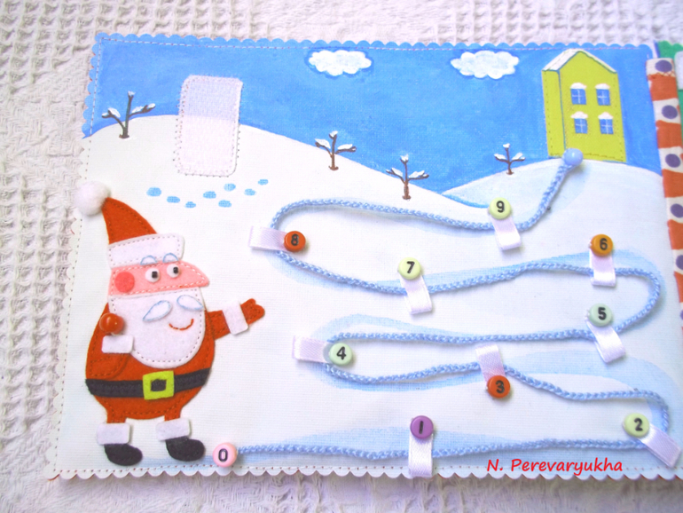 Первая страничка, на которой нужно помочь добраться Санте в домик Пеппы: для этого есть голубой шнурочек и бусинки- подсказки с цифрами (продеваем шнурочек в петельки и проводим Санту к домику)