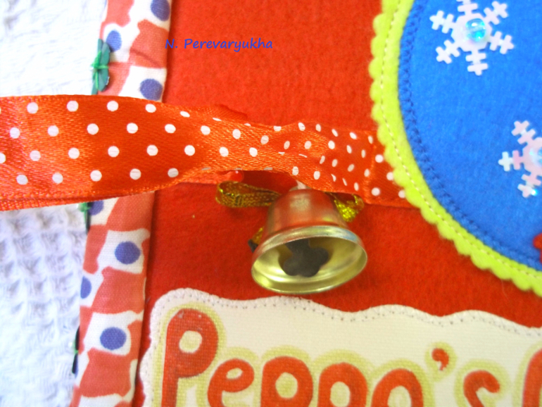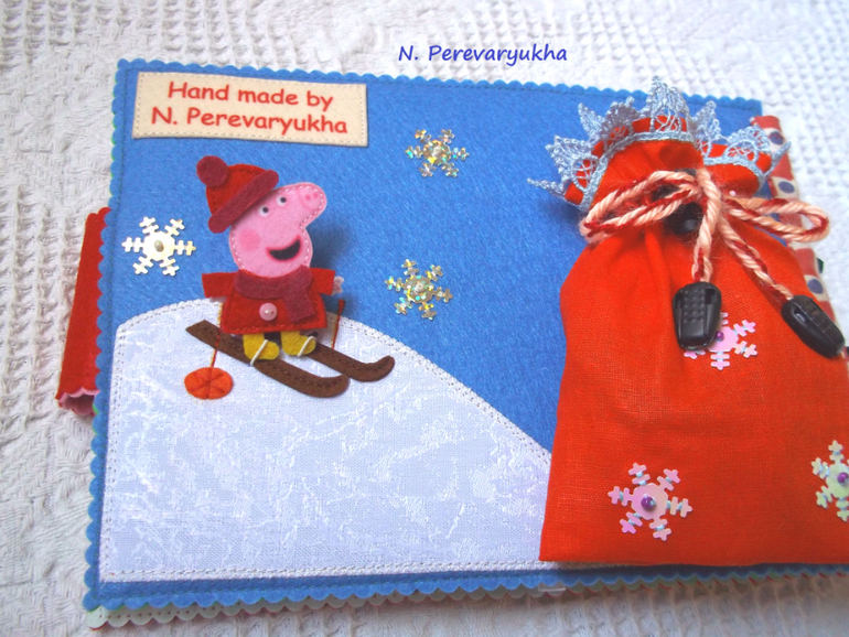 Последняя страничка-одеваем Пеппу и катаемся на лыжах (пальтишко у Пеппы на липучке, шапочка одевается. Ножки вставляются в лыжи).