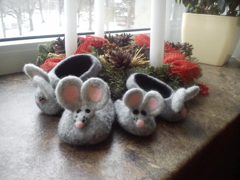 Как вам такие детские тапочки? Делала для племянника как подарок на католическое Рождество. Это моя первая попытка - надеюсь удачная! Правда еще надо сделать усики мышке и связать резиночку по кругу, так как планирую сделать пинетки.