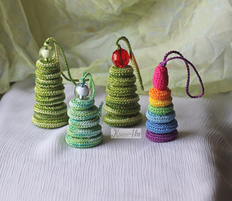 Затем продела петельку цепочки в бусину, сдвинула её и пуговицы и завязала узелок. Ёлочка готова! По такому же принципу я связала яркие пирамидки. А ещё такие игрушки можно использовать как слингоподвески. Но тогда для обвязывания использовать необработанные деревянные плоские бусины или пуговицы. И конечно, можно просто связать кругляшки разных размеров. В таком случае нужно следить за прибавлениями и убавлениями, чтобы в итоге получилась правильная пирамидка.