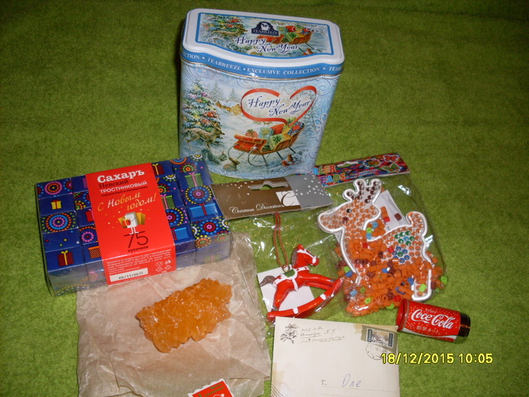 А это для всей семьи-чай в чудесной жестяной баночке,лошадка на елочку-деревянная,тяжеленькая!),термо-мозаика и чудо-сахар!)