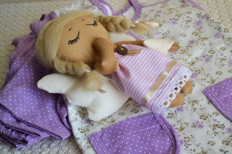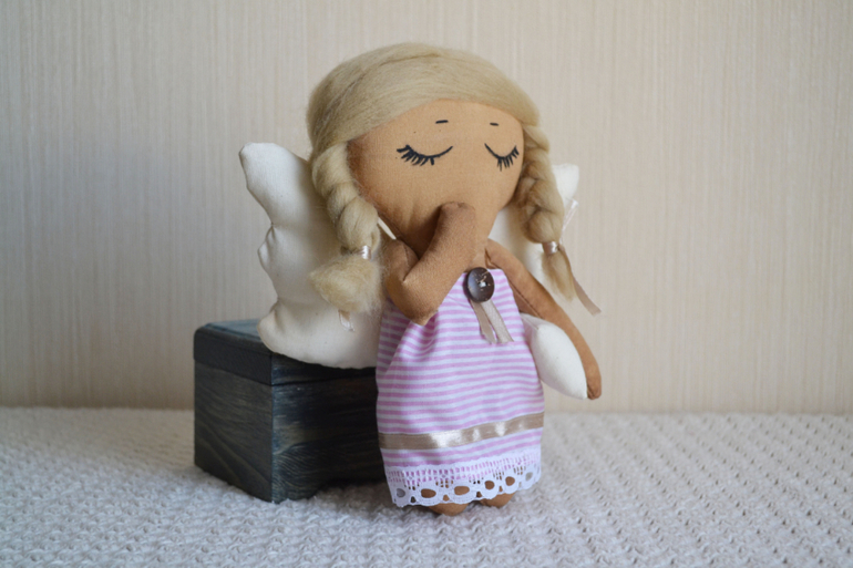 Этот шедевр - кукла - ангелочек спящий Соня, ааа, не представляете насколько она аккуратно сшита, какая приятная. Это первая Танина кукла! я бы не сказала...