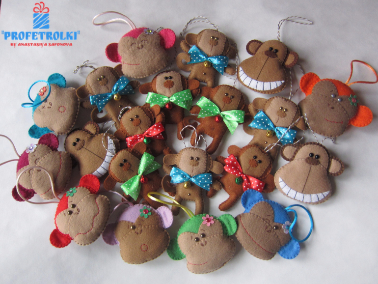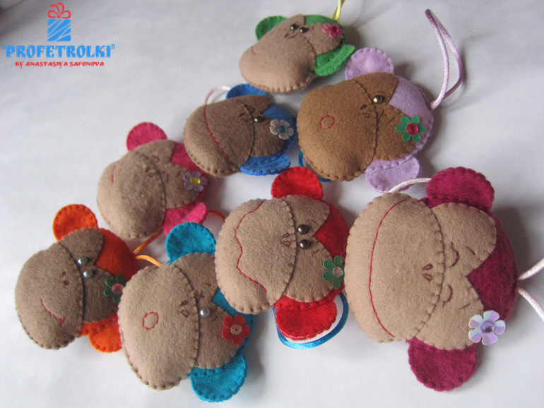 Материалы: фетр, мулине, атласные ленты и шнуры, пайетки, стразы, полубусины, бубенчики, шерстяная нить.