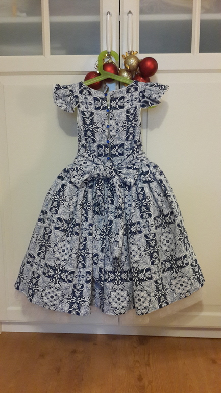 С поясом, что бы пышность немножко убавить (переборщила с подъюбниками). Пуговички заменю на прозрачные, эти конечно не подходят. Ну и фото на дочке, только такое, категорически отказалась фотографироваться(((
