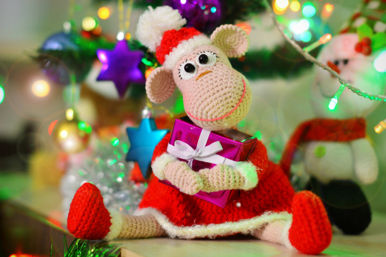 Ну и покажу еще раз свою обезьянку) платье ей украсила стразиками( но не видно на фото) Будет исполнять обязанности Деда Мороза в новогоднюю ночь) В руках держит подарок для сестренки)