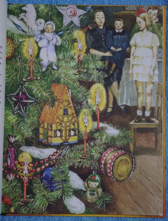 Началось всё с просмотра книги "Приключения новогодних игрушек". Как я и предполагала, она оказалась нам ещё "велика". Думаю, на следующий год хорошо пойдет. Однако, один рассказ, а точнее рисунок надолго привлек внимание дочери. И теперь при случае книга открывается именно на этой странице. Цветане очень нравится вот этот картонный домик)