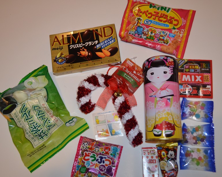 Это сладости, ммм, так много! Мы все сладкоежки))) Поэтому вкусняшки нам всегда актуальны! Здесь и полюбившиеся уже нам японские орешки в шоколаде и много не известных вкуснях! Мням, мням))) А еще меня покорил новогодний посох!!!!!!! Он такой нарядный