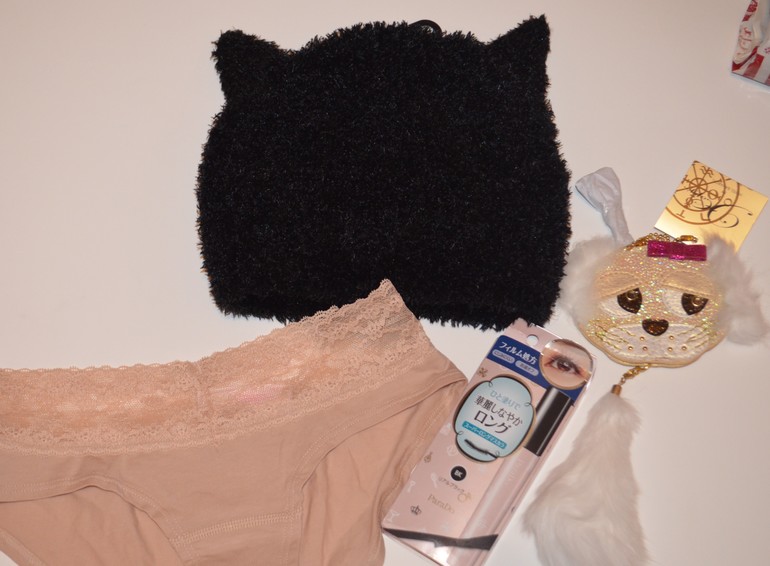 Подарочки для Полиночки: трусики ( по фактуре и форме как мои, очень классные, шапочка-кошка (Лен, Полина будет счастлива, она обожает шапочки-зверушки))) К тому же у нее на занятиях шапку сперли, поэтому сейчас прям сама актуальность! Ты прям волшебница))) Тушь для глаз, ой, ой, ой, может поделиться?))) И красивая подвесочка, такая мимимишная)))