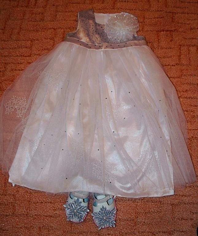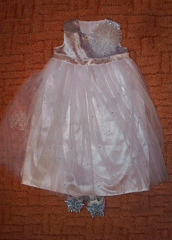 В общем купила простое белое платье голышку и туфельки тоже белые голышки были. и приложила к нему руку)) снежинки из лент, стразики асфур , Лера прям вся сверкает и блескает