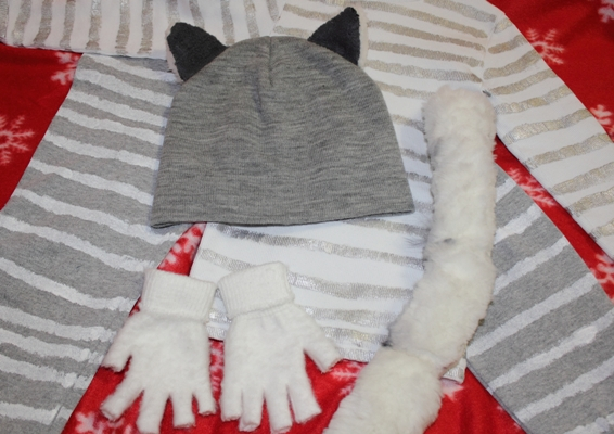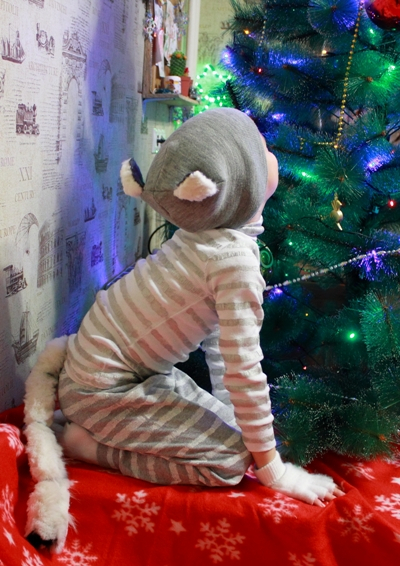 На водолазке и штанах нарисовала полоски (Валера называет это телом котика), обрезала перчатки и вывернула их начесом наружу (лапки), из меха от своего старого пуховика и флиса сшила хвост и ушки. Хвост держится на поясе из резинки, застегивающейся на липучку (очень удобно!). Вот и все, костюм готов!)