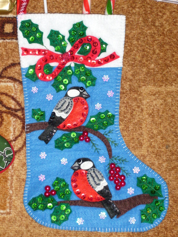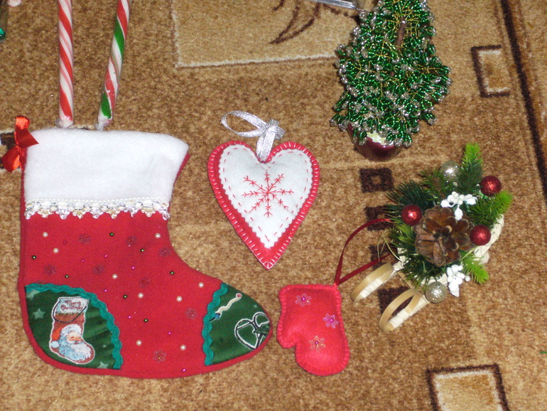 Еще один сапожок ,фетровые игрушечки на елку ,бисерная елочка,которую сделала доченька Татьяны просто изумительная! Как,как ребенок мог создать такую красоту? Уму непостижимо! Я в полном восторге и восхищении!!!!