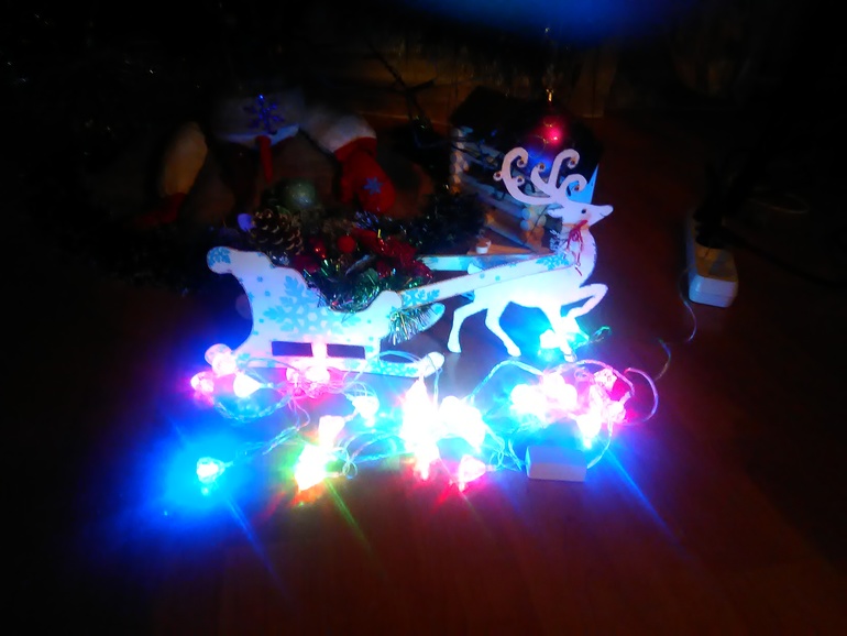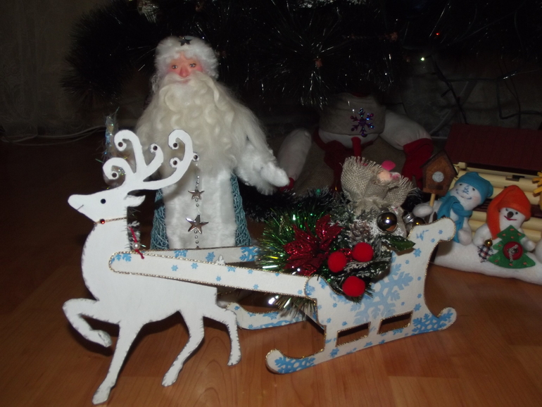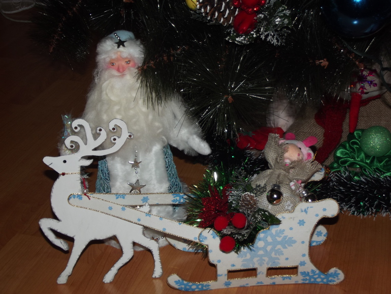 И ещё... у моего Деда Мороза появились настоящие (из картона) сани!!!! Сын ходит у ёлки и повторяет "Красотища!", я радуюсь, что замечает и восхищается. Дед Мороз стоит под ёлкой, иногда внизу Тема включает гирлянду и тогда как в сказке!