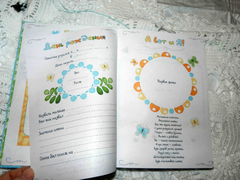 Очень вместительная книжечка. Здесь мамочка сможет вклеить узи снимки, около 15 фото, сделать записи о росте и достижениях малыша от рождения до года(каждый месяц) и потом с года до 7 лет (каждый год), здесь много красивых стихотворений о малыше. Приятно будет читать и смотреть такую книжечку, спустя много лет. А дальше под кат много фото!