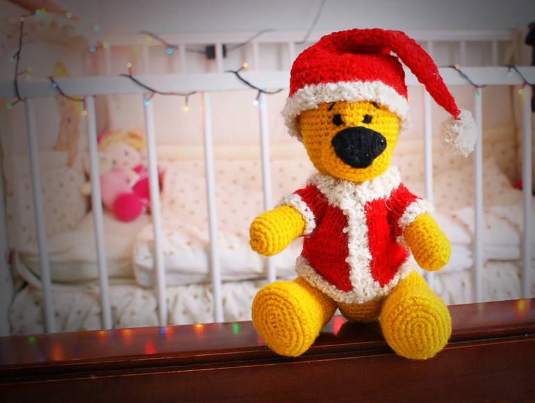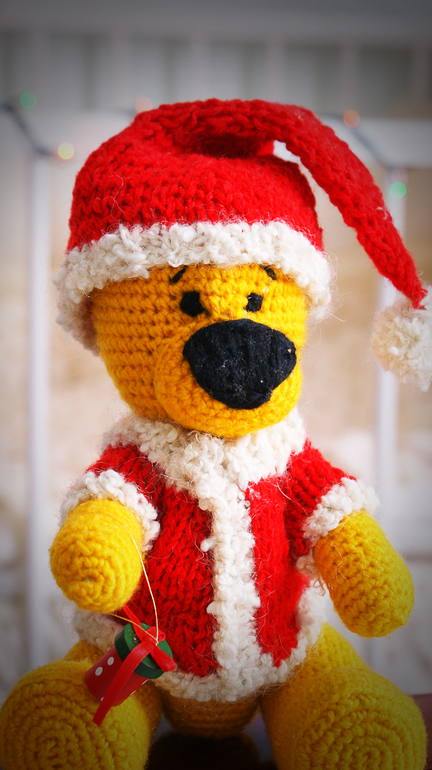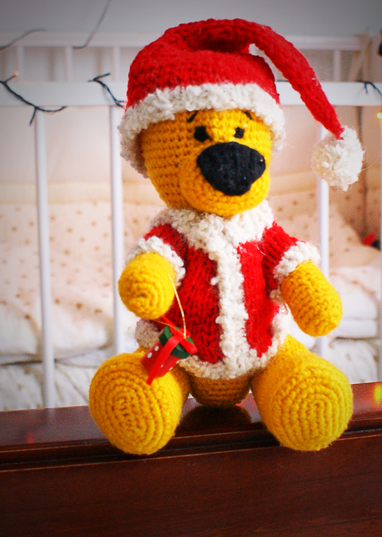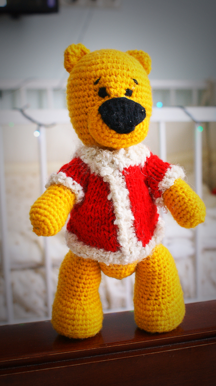это мой второй мишка, связала его специально под елочку)))) этот уже хорошенький, ровненький получился))))) буду дальше руку набивать)))
