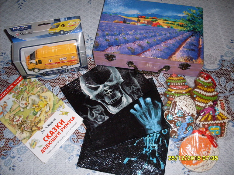 Димику чудесная книжка и спец.машина-основательная,металлическая,все,как нам надо!))(уже подарена)А мне просто потрясающая шкатулочка в стиле прованс-очень красивая! И прянички ароматные,для всей семьи! Чудесная новогодняя посылочка! Танечка,спасибо тебе огромное! С новым годом!!! Здоровья,счастья,любви и творческих успехов!
