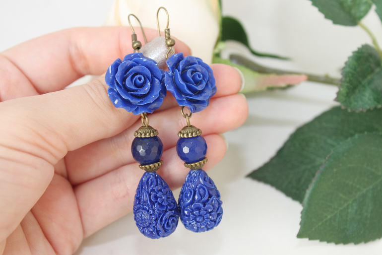 19. Серьги "Синие розы" Фурнитура под бронзу, резная смола, тонированный нефрит