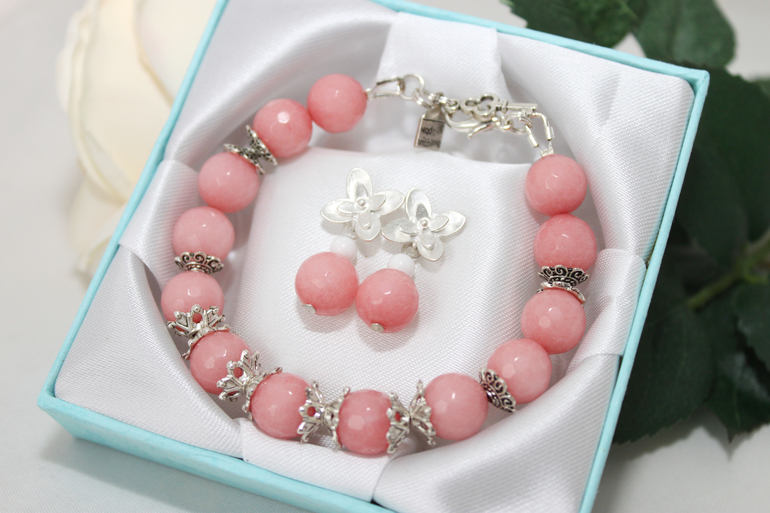 6. Комплект "Розовая дымка" Фурнитура под серебро, агат. Браслет на руку 15-17см