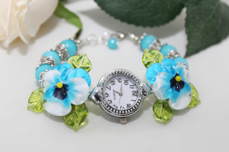 13. Часы "Анютины глазки" (бело-голубые) Фурнитура под серебро, агат, авторский лэмпворк. Браслет собран на ювелирный тросик