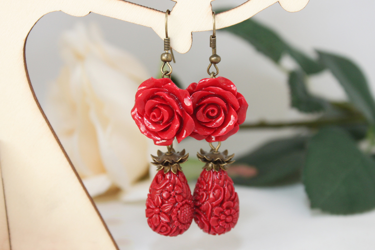 18. Серьги "Красные розы" Фурнитура под бронзу, резная смола
