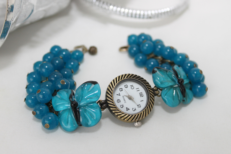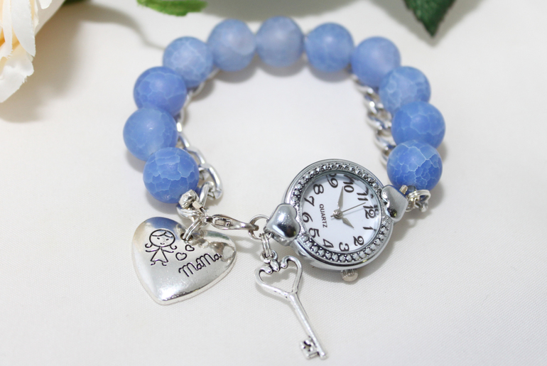 11. Часы " С любовью..."Фурнитура под серебро, агат, кварцевый механизм. На запястье 15см