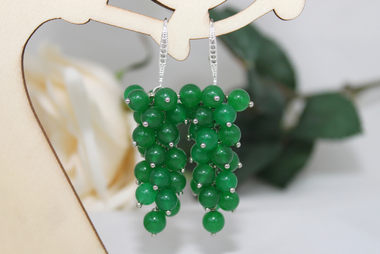 17. Серьги "Мятные капли" Фурнитура под серебро, тонированный нефрит, резная смола
