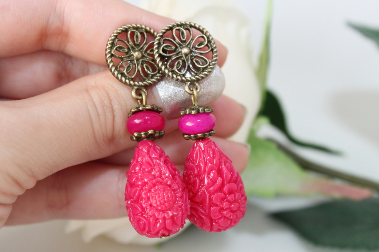 16. Серьги "Фуксия" Фурнитура под бронзу, тонированный нефрит, резная смола
