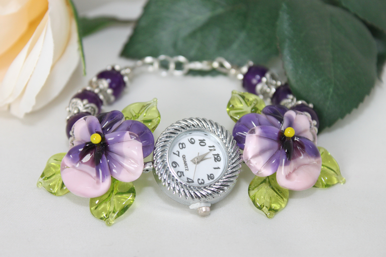 12. Часы "Анютины глазки" сиреневые. Фурнитура под серебро, кварцевый механизм, авторский лэмпворк, тонированный нефрит. Браслет собран на ювелирный тросик