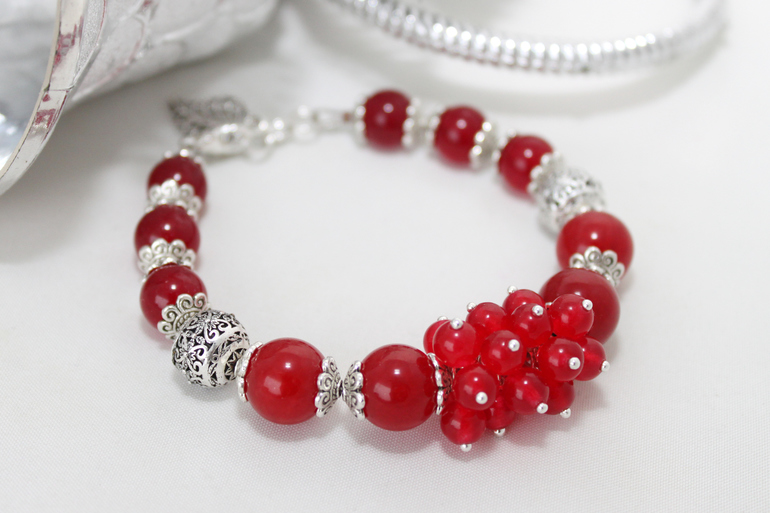 9. Браслет "Красные ягоды" Фурнитура под серебро, тонированный нефрит