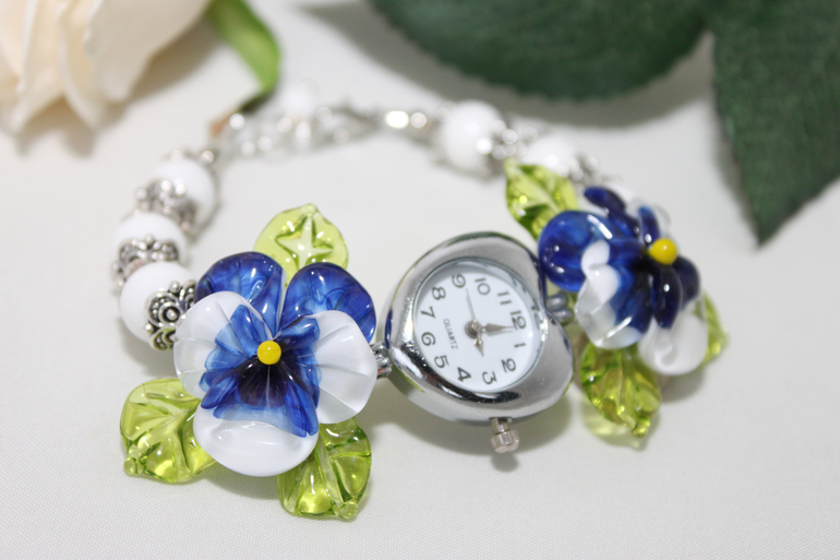 14. Часы "Анютины глазки" бело-синие. Фурнитура под серебро, кварцевый механизм, авторский лэмпворк, агат. Браслет собран на ювелирный тросик