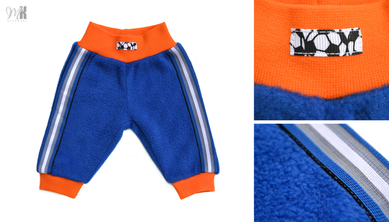 Брючки из василькового флиса, по бокам - лампасы, а на поясе - нашивка из репсовой ленты.